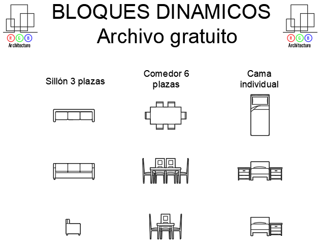 En las ultimas semanas se ha vuelto muy viral el tema de bloques dinámicos para el software de AutoCAD, estos son bloques que se pueden editar de forma rápida y sencilla adaptándose a cada uno de los proyectos, puede recordar a las familias de Revit, básicamente utilizan parámetros parecidos para su edición, el día de hoy quiero traerles un archivo con bloques dinámicos, cuenta con un bloque de sofá, uno de comedor y uno de cama individual, este archivo será gratuito y solo deberán descargarlo, en otro post subiré uno con más bloques.